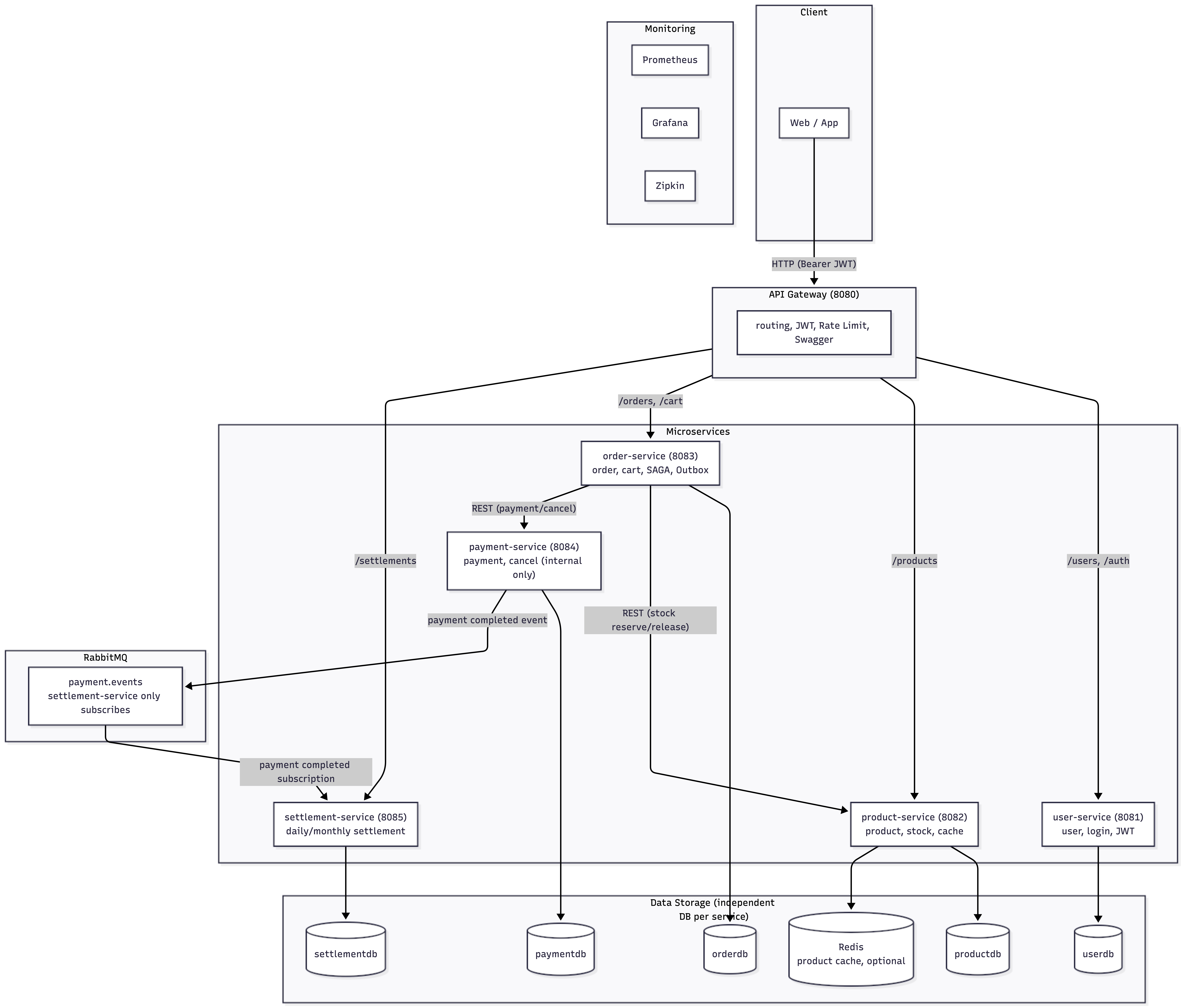 - ›API Gateway(8080): JWT 검증, 라우팅, Rate Limit(120 req/min)