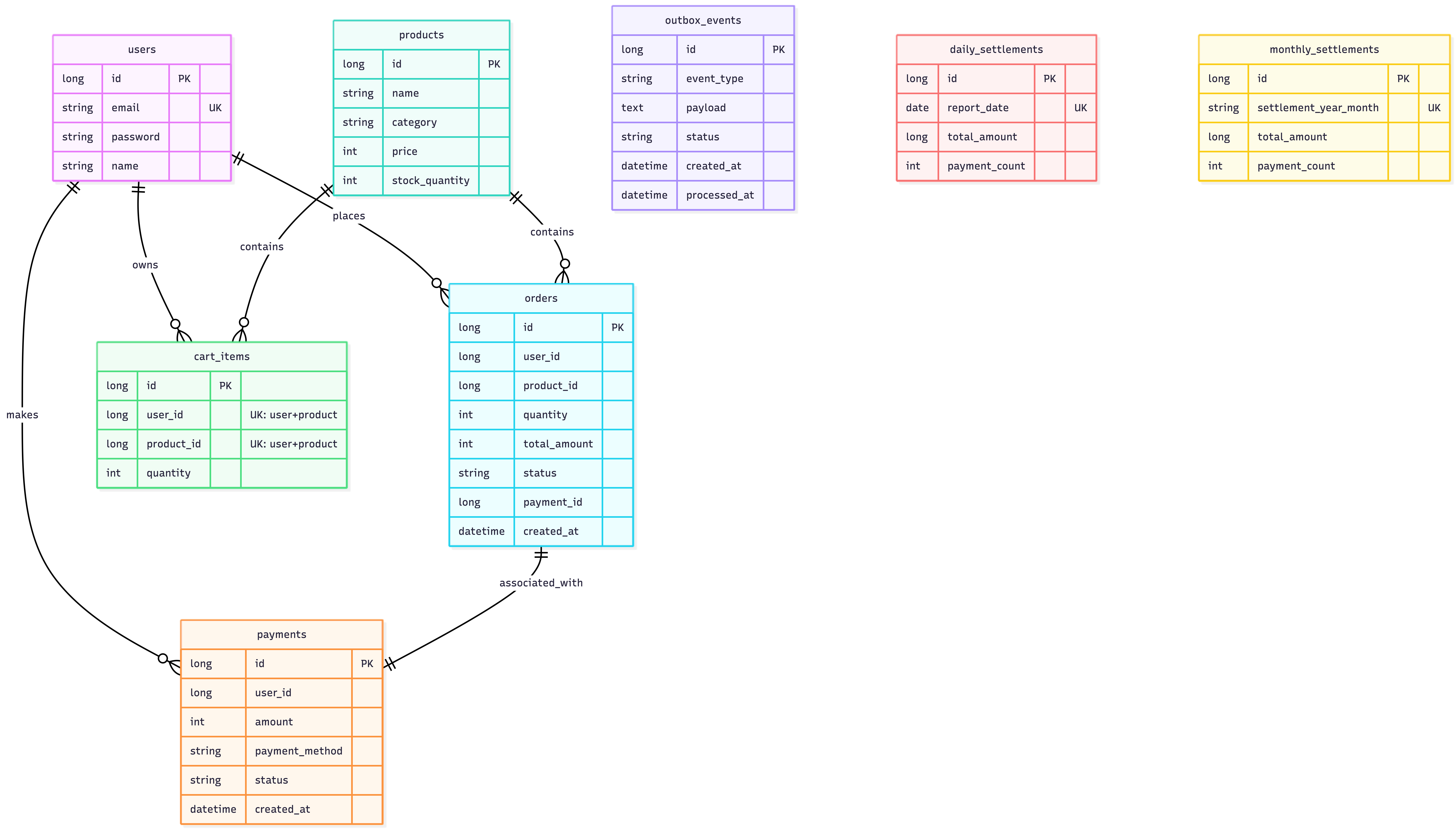- ›Outbox Processor: 5초 간격 폴링, 배치 20건씩 처리, 결제 취소·재고 복구 호출
