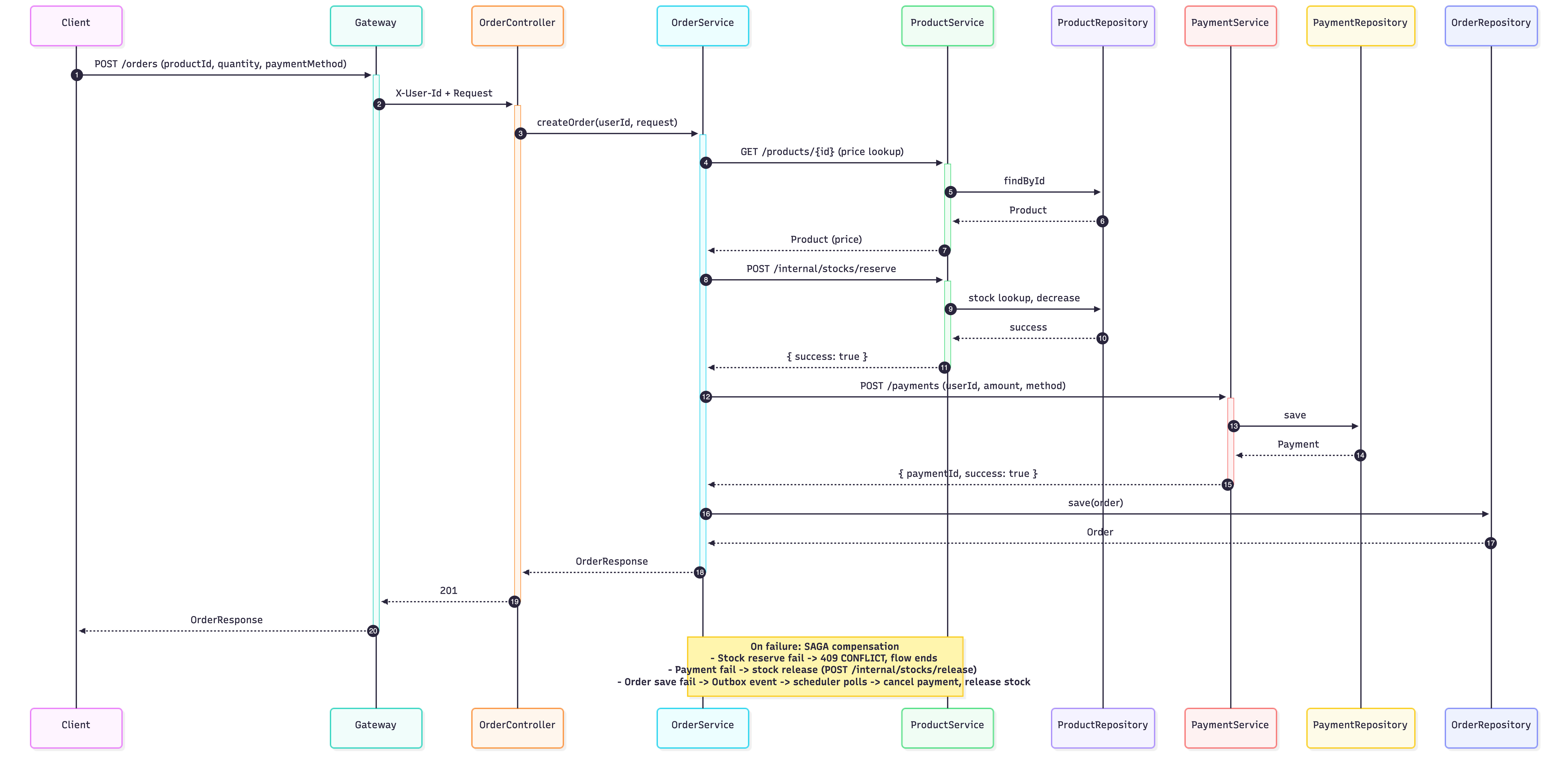 - ›SAGA: 재고 예약 → 결제 → 주문 저장, 실패 시 보상 트랜잭션 실행